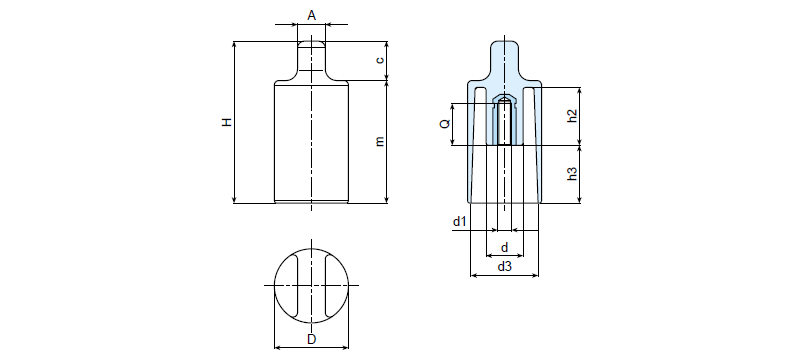 | Art. | D | H | d | A | c | m | h2 | h3 | d3 | d1 | Q | Weight (gr) |