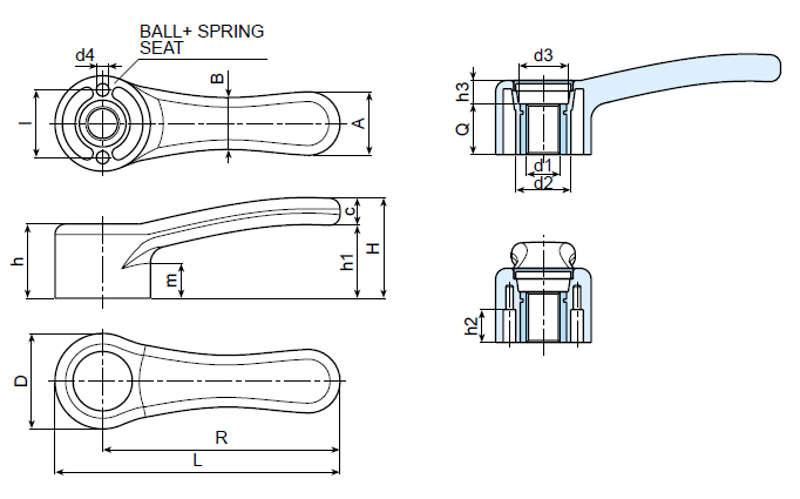 | Art. | R | L | D | H | h | h1 | h2 | h3 | m | I | A | B | c | d2 | d3 | d4 | d1 | Q | Weight (gr) |