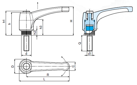| Art. | L | R | H | D | d | c | h | h1 | h2 | h3 | d1 | Q | Weight (gr) |