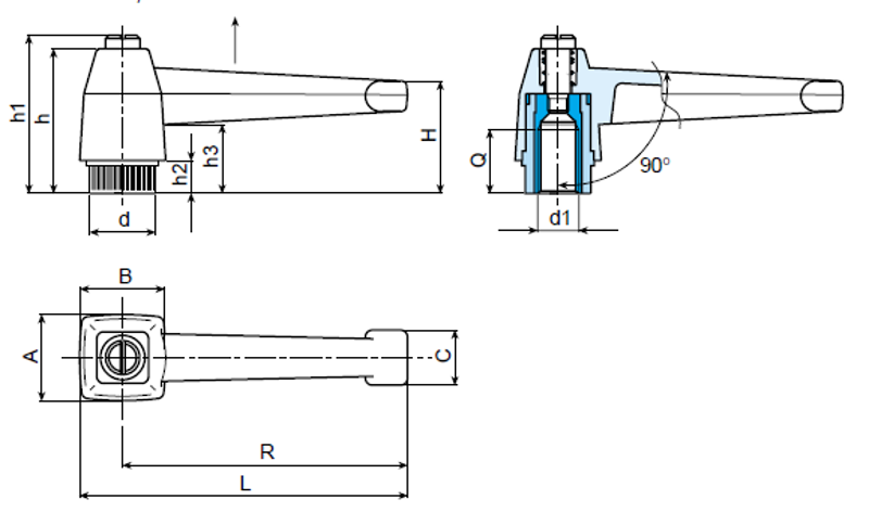 | Art. | L | R | H | A | B | c | h | h1 | h2 | h3 | d1 | Q | Weight (gr) |