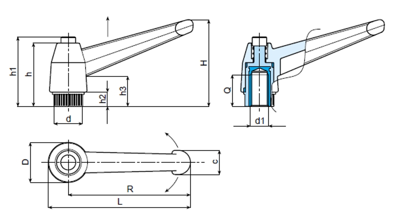 | Art. | L | R | H | D | d | c | h | h1 | h2 | h3 | d1 | Q | Weight (gr) |