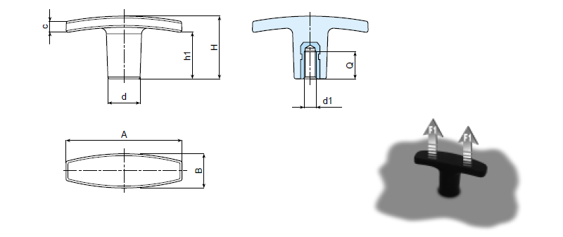 | Art. | A | B | H | h1 | c | d | d1 | Q | Weight (gr) | F1 (N) |