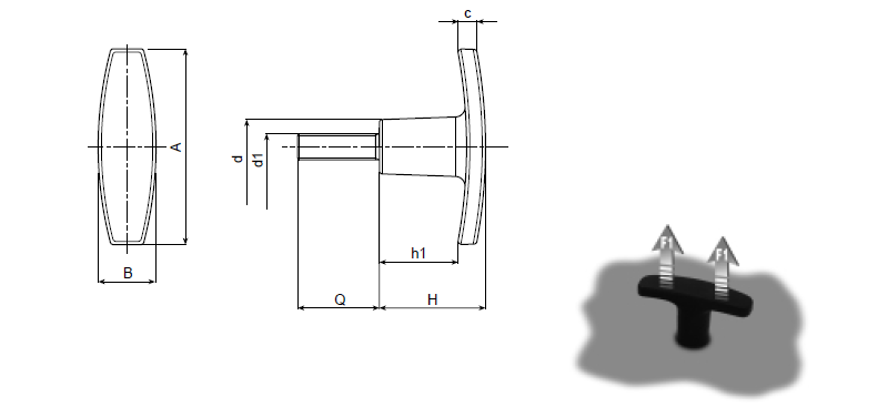 | Art. | A | B | H | h1 | c | d | d1 | Q | Weight (gr) | F1 (N) |