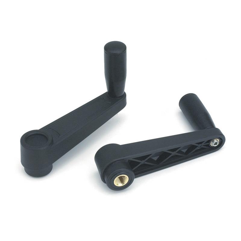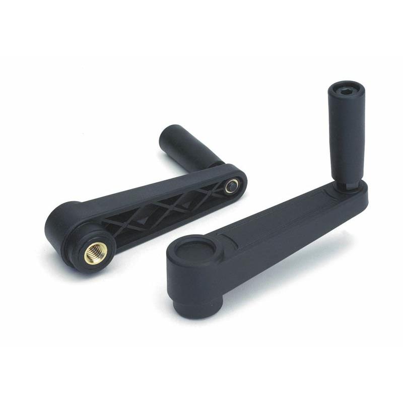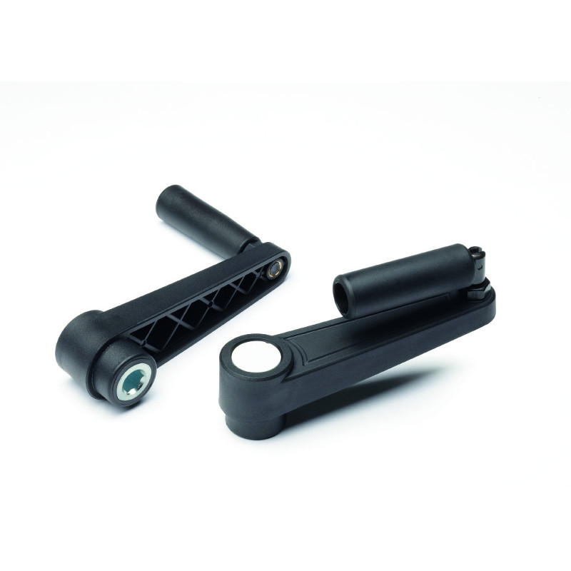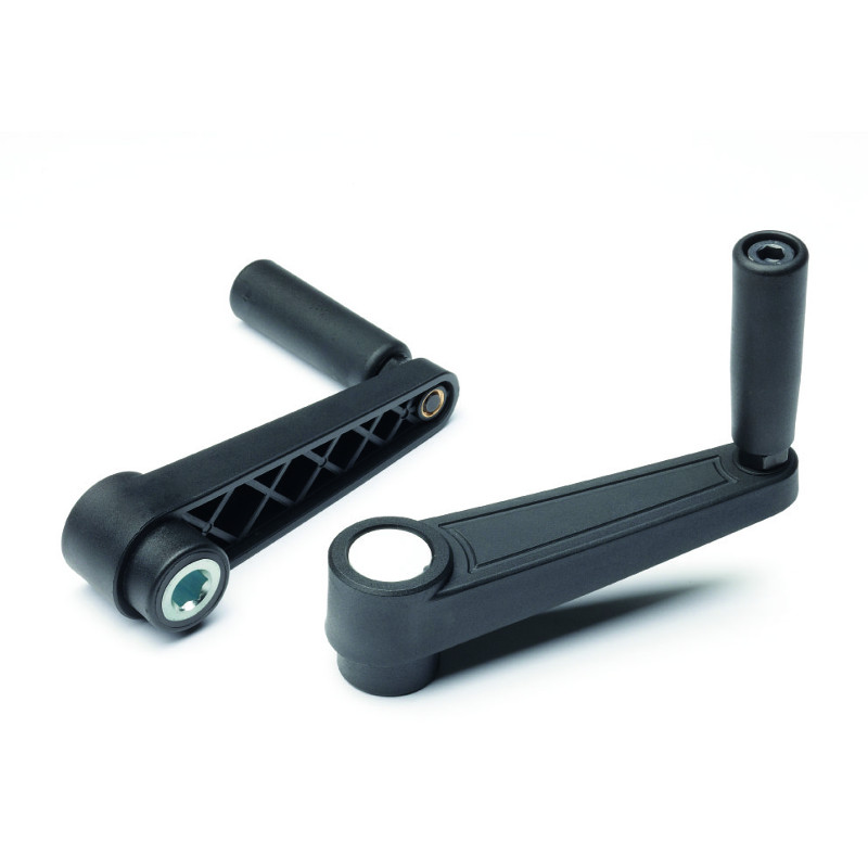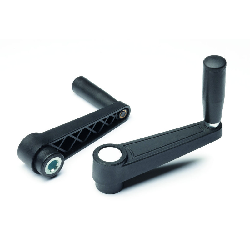 Crank handles can prove a very good lower cost option than a full control handhweel. Normally used for winding operations where a higher degree of torque might be required. There are 5 different size options available in terms of the length of crank handle and there is even an indexing version where there could be space restrictions. The crank handles are manufactured in glass filled nylon material with a variety of insert materials including brass, steel and stainless steel. Special inserts can be accommodated, just enquire with us, MOQ’s will usually apply. Crank handles come in both threaded and bored versions and can have holes through or blind, as required and there is normally a cap over the end as standard which can be changed for different colours if you wish to highlight a colour on your product, just ask.