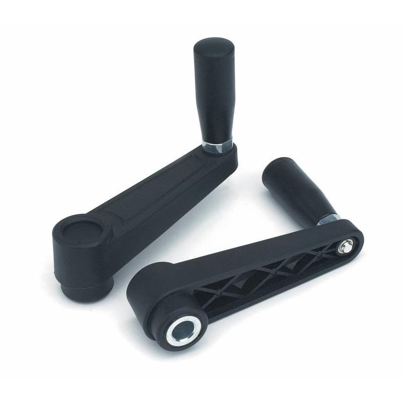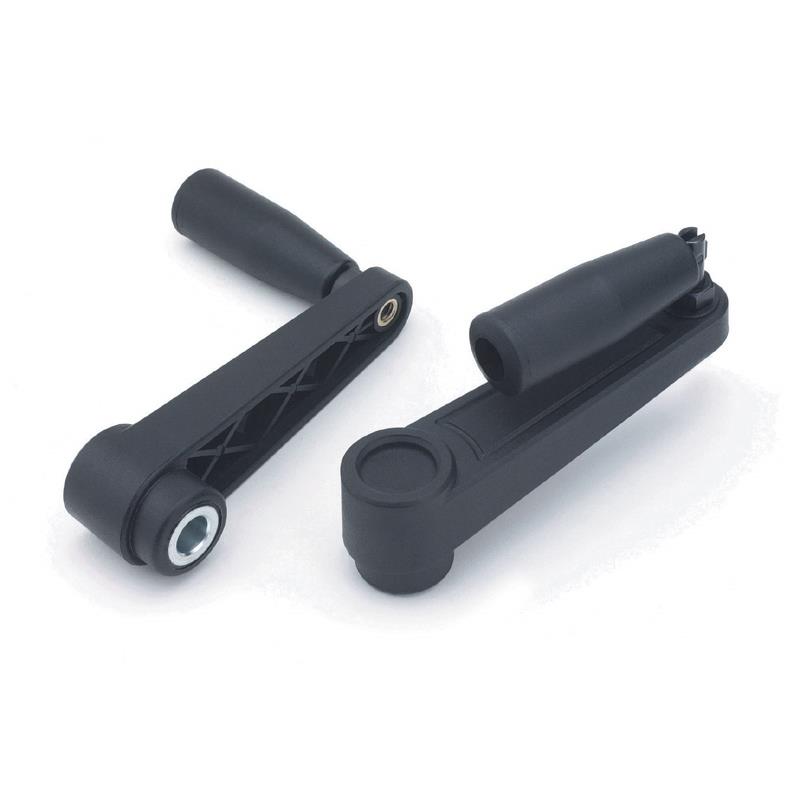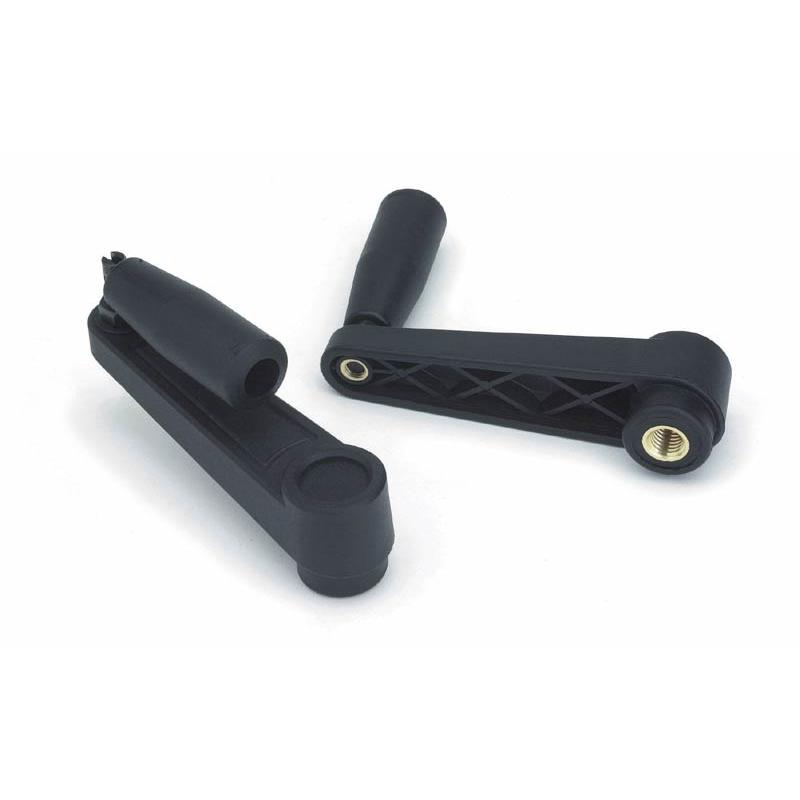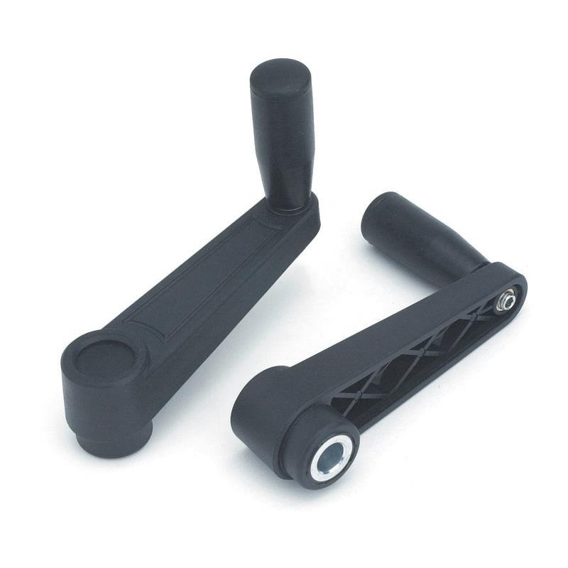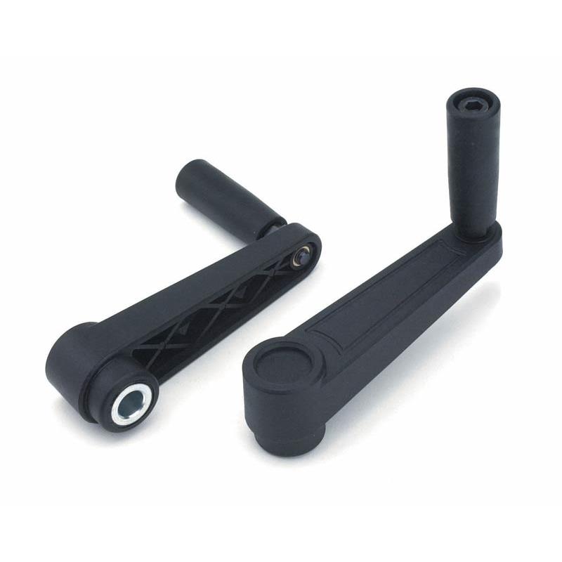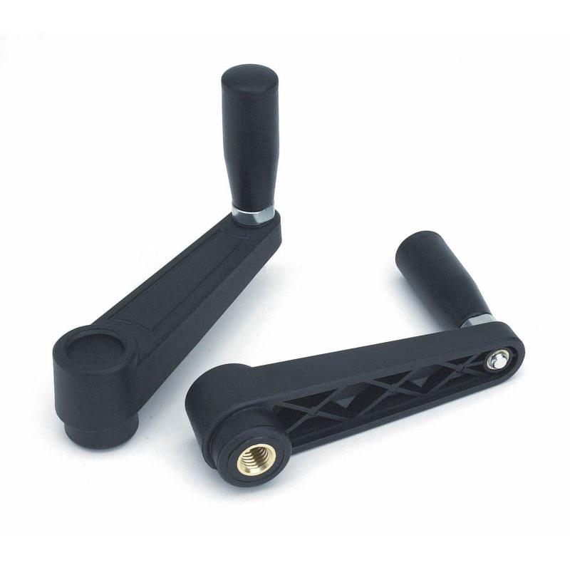 Crank handles can prove a very good lower cost option than a full control handhweel. Normally used for winding operations where a higher degree of torque might be required. There are 5 different size options available in terms of the length of crank handle and there is even an indexing version where there could be space restrictions. The crank handles are manufactured in glass filled nylon material with a variety of insert materials including brass, steel and stainless steel. Special inserts can be accommodated, just enquire with us, MOQ’s will usually apply. Crank handles come in both threaded and bored versions and can have holes through or blind, as required and there is normally a cap over the end as standard which can be changed for different colours if you wish to highlight a colour on your product, just ask.